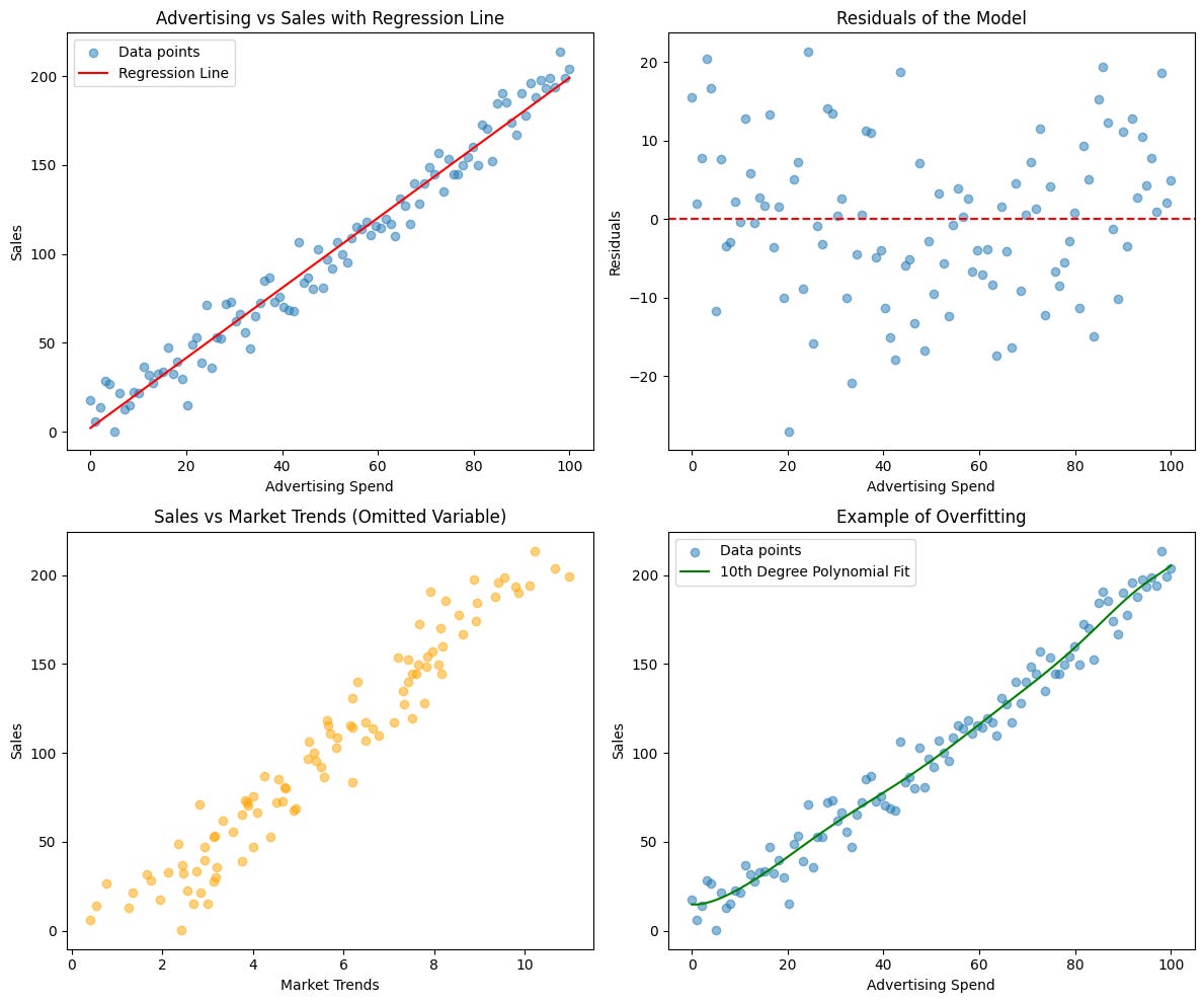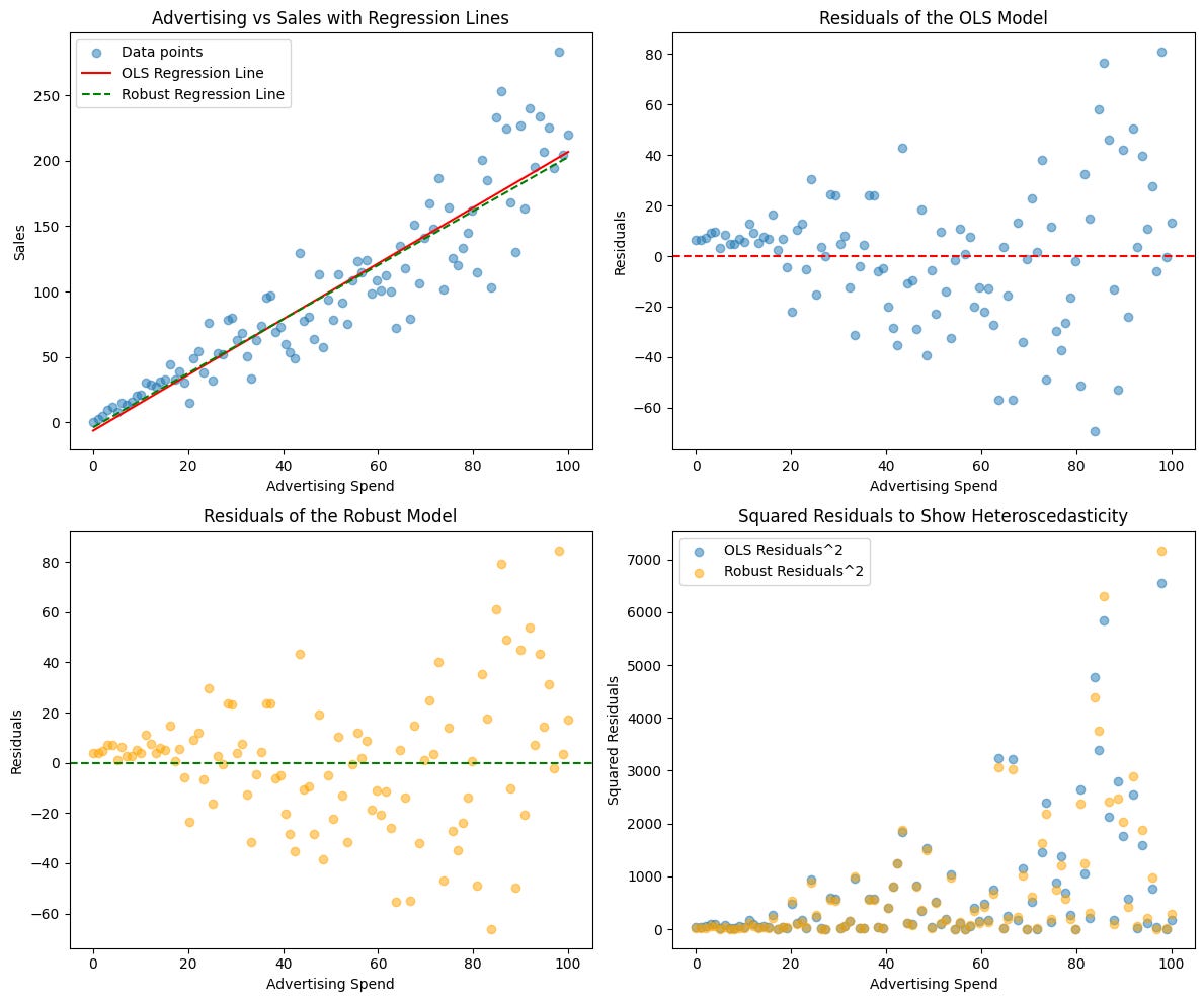 - Reality: Violations of assumptions can affect the results, but in practice, minor violations may not severely impact the model’s usefulness. Robust regression techniques and diagnostics can help mitigate issues. Predicting sales based on advertising spend might have some heteroscedasticity (changing variance of residuals). While not ideal, the model can still provide useful insights, especially if robust standard errors are used.