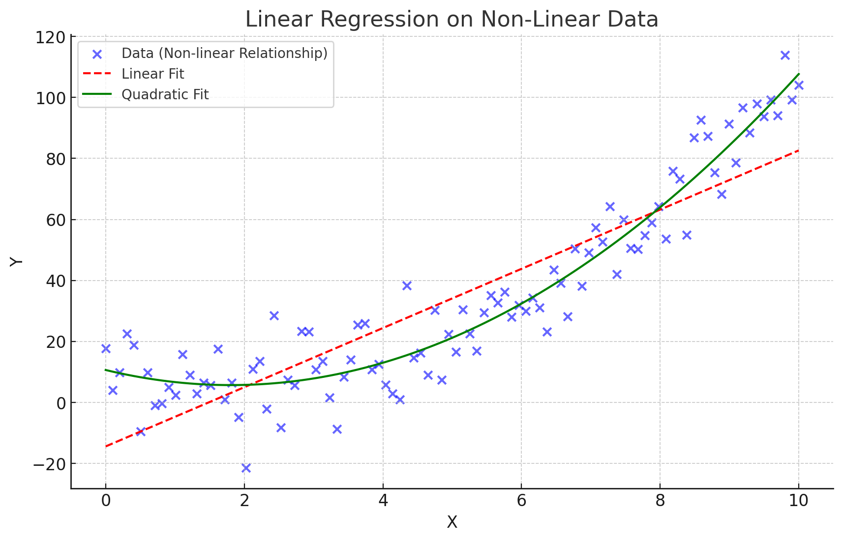 - Reality: Linear regression can handle non-linear relationships by transforming the predictor variables (e.g., polynomial terms, logarithmic transformations). Predicting the growth rate of a bacterial culture over time may not be linear. By including a quadratic term (time²) in the regression model, the non-linear relationship can be captured more accurately. In many professions, income increases rapidly early in a career, levels off, and might even decrease as retirement approaches. A quadratic regression model (including age and age² as predictors) can better capture this non-linear relationship than a simple linear model.