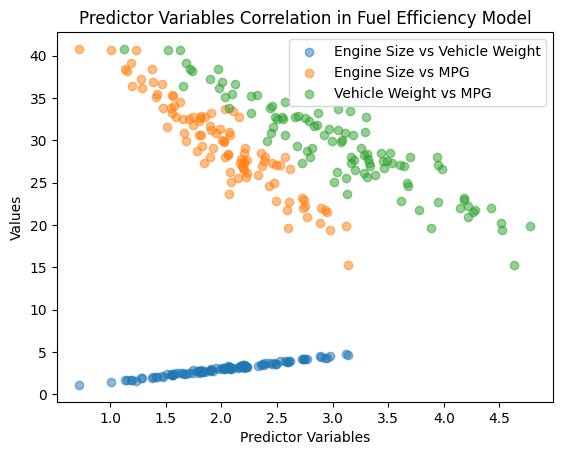 - Reality: Predictor variables can be correlated. However, high multicollinearity can make it difficult to determine the individual effect of each predictor and can inflate the variance of the coefficient estimates. In a model predicting car fuel efficiency (MPG), the predictors engine size and vehicle weight are likely to be correlated. The model can still be valid, though multicollinearity might affect the precision of the coefficient estimates. The number of rooms and total square footage are likely correlated because larger houses tend to have more rooms. This multicollinearity doesn’t invalidate the model but might make interpreting individual coefficients more challenging.